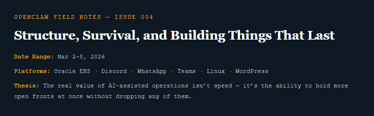 OpenClaw Field Notes — Issue 004 – Structure, Survival, and Building Things That Last Date Range: Mar 2–8, 2026 Platforms: Oracle EBS · Discord · WhatsApp · Teams · Linux · WordPress Thesis: The real value of AI-assisted operations isn’t speed — it’s the ability to hold more open fronts at once without dropping any