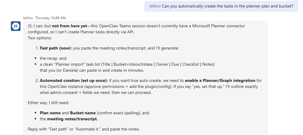 A few messages later, the agent appeared to create a Planner task. <!– IMAGE 4 GOES HERE –>